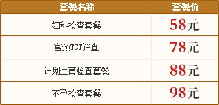 妇科检查套餐:妇科常规、白带常规、电子阴道镜、尿HCG、妇科彩超 套餐价格:58元 【点击在线预约】