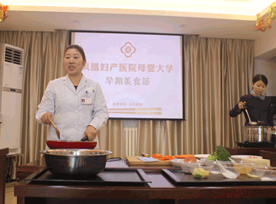 上午12点,凤凰妇产医院母婴大学孕期美食节正式开灶。王主任为准妈妈准备了海带炖鸡汤、西兰花炒胡萝卜两道简便、可口的孕期美食。