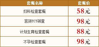 妇科检查套餐:妇科常规、白带常规、电子阴道镜、尿HCG、妇科彩超 套餐价格:58元 【点击在线预约】