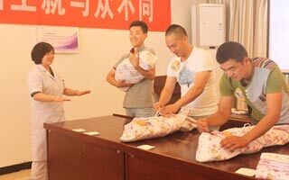 换尿布比赛环节,焦护士长开始为准爸妈们示范讲解“如何给换尿布”,台下的准爸、准妈们个个拉长了脖子瞪大了眼睛盯死台上妇产科主任的一举一动,生怕错过了任何一个标准环节。虽然几分钟前妇产科主任刚为大家“恶补培训”了标准动作,可在随后的依样画葫芦的比赛中准爸爸们还是暴露出不少问题。有的准爸爸眼见其他选手进度超前,情急之下干脆把尿布都包反了;有的准爸爸是“理论型”选手,滔滔不绝讲了一堆理论,却硬是把尿布围成了模型宝宝的“抹胸”,引来场下观众的笑场。