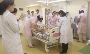 “院内5床产妇突然出现胸痛、呼吸困难……”伴随着演练的开始,医护人员迅速进入工作状态。组织分工、专家会诊、用药、同患者家属沟通交流,每个步骤都和实战一样,现场气氛紧张而有序。