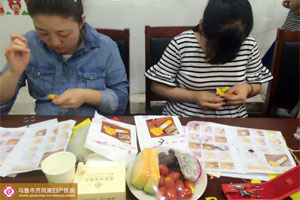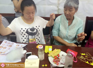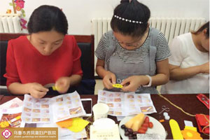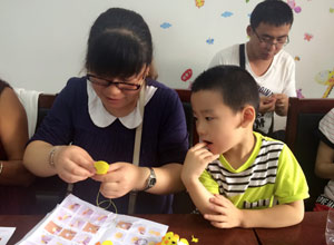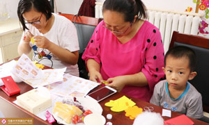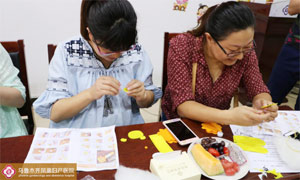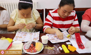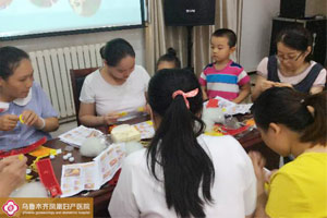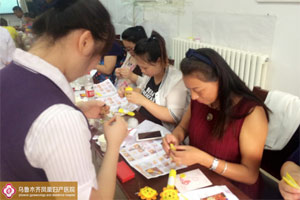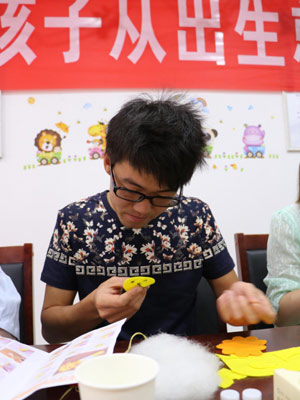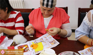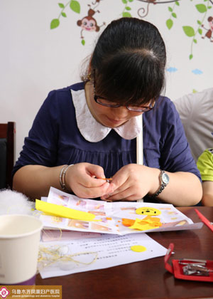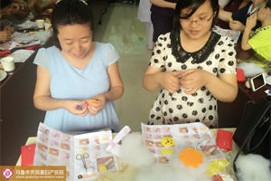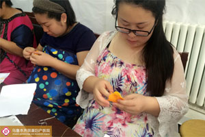 舒缓的胎教音乐声中,妈妈们穿针引线,为肚里的宝宝亲手制作一只意义非凡的小摇铃。