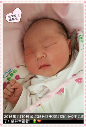 2016年11月9日10点35分,随着一声响亮的啼哭,一个可爱、健康的小公举出生了!体重6斤2两!那是个幸福的时刻!新爸爸回想到初次见到宝宝时的场景,至今满脸都是幸福的表情,说那是他一生难忘的日子,也是他这一生除了结婚以外最为神圣的时刻。