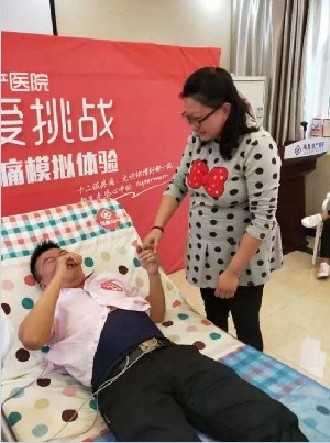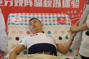 当丈夫躺在产床上开始体验时,站在一旁的妻子和大家一样笑了起来。随着痛级的增加,起初笑着的她,看着丈夫越来越痛苦的表情不由得心疼起来。丈夫还在坚持着,妻子已红了眼眶。