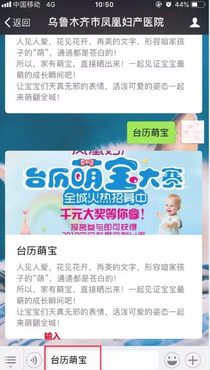 2、进入微信公众号,对话框发送关键词“台历萌宝”,点击弹出的活动页面即可进入